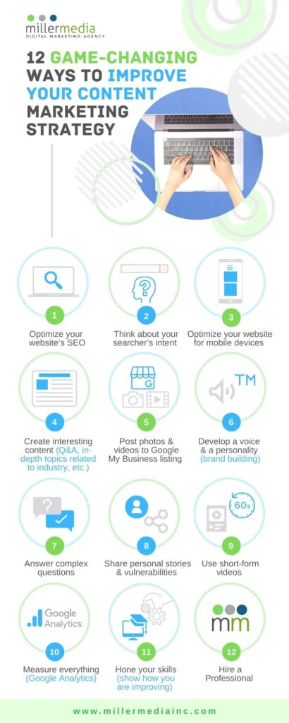 Whether you are a small business or corporate enterprise it is important for you as a business to understand your unique value position. Define your audience and create user personas to narrow down who to address in your marketing material. Know your keywords and write amazing informative content that your potential client can’t resist to increase web traffic. Here are 12 additional content marketing strategy tips to help you succeed in grabbing audience attention: